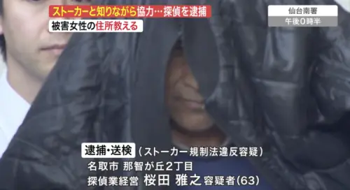 仙台南署は1日、依頼人の男(63)がストーカー行為をすると知りながら女性の住所を教えたとして、ストーカー規制法違反の疑いで、探偵業、桜田雅之容疑者(63)=宮城県名取市那智が丘=を逮捕した。逮捕容疑は5月ごろ、仙台市太白区で、依頼人がストーカー規制法に基づく禁止命令を受けていることを知っていたにもかかわらず、女性の住所を教えた疑い。
